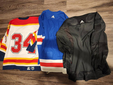 I am combining and selling 3 items at one low price. In this ad I am selling a black, long sleeve hockey jersey by Adidas. It has an NHL logo on top, by the collar, and while it does not have a specific team on the shirt, it is an official hockey jersey, that is built like the ones that are worn in games. The...
