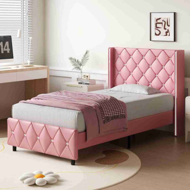 This bed frame king size is upholstered in leather and features a headboard and footboard inlaid with diamonds, adding a touch of sophistication and becoming the focal point of the room