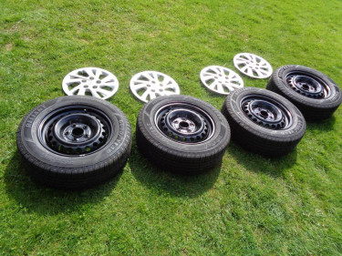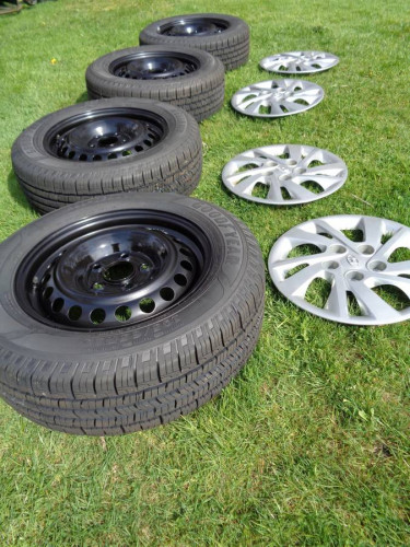 I have 4 Hyundai Elantra metal rims and new Goodyear Reliant all season 195/65R15 tires with Hyundai original rim covers, all in very good condition. Tires have been balanced and are ready to mount on your car. CASH only please.Check out pics. I have receipt for Goodyear tires.