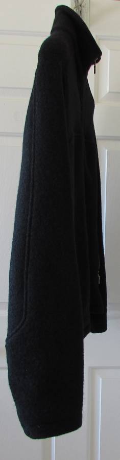 IBEX 100% Boiled New Wool Mens Large Black Heavy Full Zip Front Coat with Zippered Pockets Made in the USA Includes Setwell 20" Wooden Hanger to properly support the shoulders of this heavy jacket. Features: Made in the USA Embroidered with IBEX Logo between the Shoulder Blades Sturdy Zip up front clos...