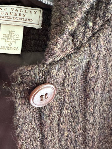 In its own zippered, plastic storage bag with hanger, free of charge. An imported product from Boyne Valley Weavers, this wool jacket is done in a rich, dark shade of brown. (The lighting makes the color appear lighter.) It is about a mid-calf length, similar to the length of a parka. It is fully silk-...