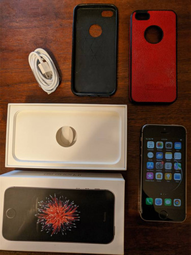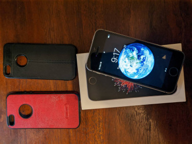 Unlocked iPhone SE 1st Gen 32 GB with a choice of red or black protective case