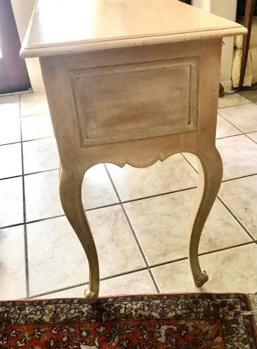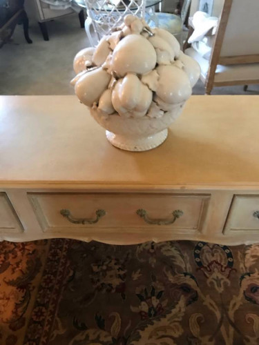 6 feet long by 18 deep and 32 inches high, this excellent, Italian - made sideboard / buffet / credenza is crafted of Italian pine with a yellowed whitewash finish. About 25 years old - in excellent condition but for a few discreet blemishes. Fully finished on all sides with lots of carved pretty curves. Dra...
