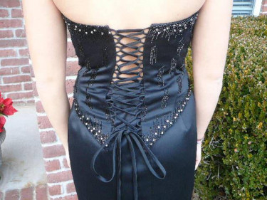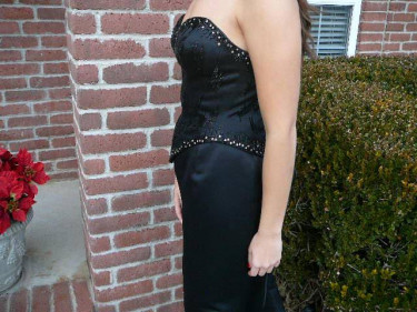 This is a beautiful, black color, satin, two (2) piece formal. It has a bustier top, strapless, sweetheart neckline, embellished beads and sequin lace up back. The skirt is fitted tight with small train. Worn only once. Size 6. Brand is Joli Prom. Great condition. Non-smoking home. Worn by model approximate...