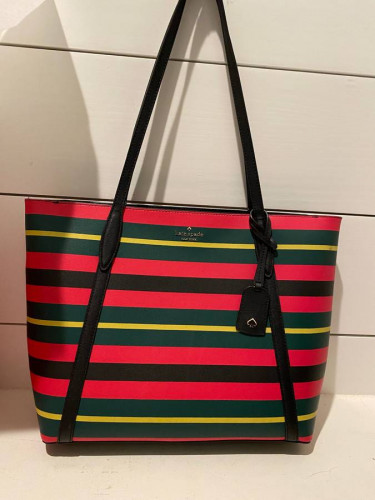 Kate Spade Cara Wrapping Paper multicolored stripe 1) Large Tote Shoulder bag, 2) handbag, and 3)wallet set. Multicolor with Light Gold tone hardware. style # WK4607 Textured PVC and Leather Zip closure Front metal Kate Spade Logo Charm Interior slip pocket External back slip pocket ...