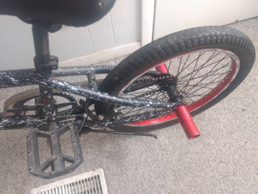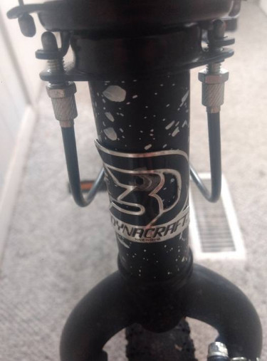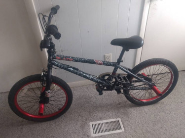Kids Dynacraft black BMX-style bicycle for sale. The bike features pegs on the front and real wheels, and it has a kickstand. Rear caliper brake works fine but the front caliper brake needs work on the cables. Tires hold air but the treads are worn. See pictures. Can meet around Arlington or if ne...
