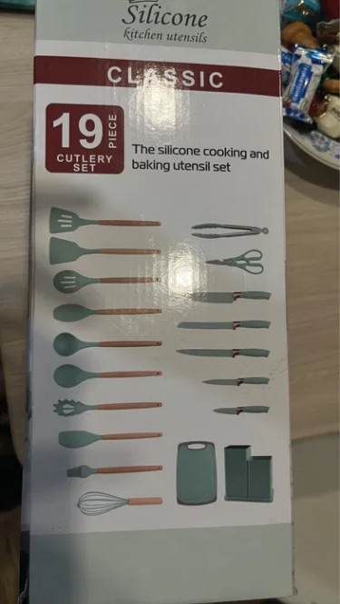 A set of kitchen utensils: 19 items Good quality Sharp knives with wooden handles Silicone cooking spoons