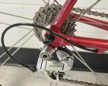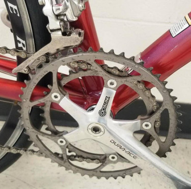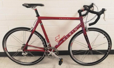 Beautiful Klein Q-Pro Carbon Team road bike. The lightweight aluminum frame supports full Dura-Ace components including the crank, derailleurs, brakeset, shifters and levers. The fork is Klein Aeros carbon fiber, and the wheels are Bontrager Race X-Lite. This bike rides very nicely and has a 58 cm frame size ...