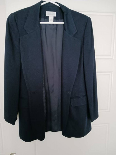 I am offering two identical women's two-piece career suits, one in black and one in navy blue. EACH suit is $40. They were worn only a few times and are in very good condition with no flaws noted. They are very well-constructed, made in the USA, and the style is classic. The jacket and skirt are fully line...