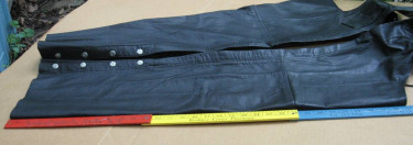 EMAIL, CALL OR TEXT ONLY - NO VOICEMAILS EXACT CASH ONLY ON PICKUP - $35 FIRM BLACK LEATHER CHAPS IN VERY GOOD CONDITION. NOT SURE IF THEY ARE WOMENS, MENS OR UNISEX. MARKED SIZE SMALL. ONE POCKET. LEG CLOSURE UP LEGS SNAPS THEN ZIPPER. MEASURE: APPROX 33" DOWN THE SIDE AND APPROX 21" ACR...