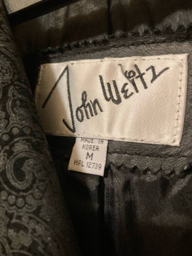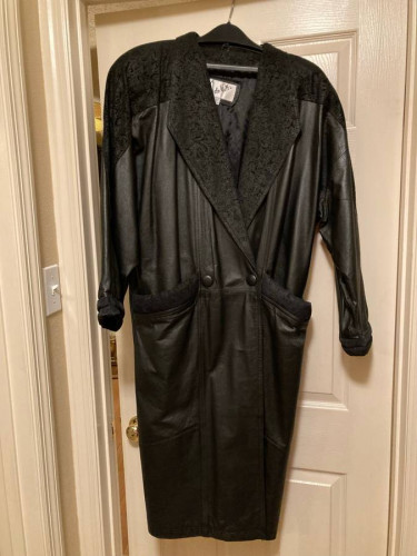 1990’s John Weitz Women’s Long Black Leather Trench Coat. WPL 12739 Size Medium Like New Condition! Measures 48” inches long (from the top of the collar to the bottom) From arm pit to arm pit measures 26” inches Sleeves are 17” inches long (from arm pit to end of sleeve) Decorative trim ma...