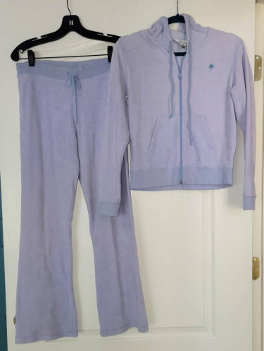 This is a women’s LILLY PULITZER cotton/nylon/spandex (has stretch) sweatshirt and matching pants in a pretty light blue. The shirt has two front pockets, a Lilly zip pull, embroidered Lilly palm logo on chest, and a tie hood. The pants have tie elastic waist, one back pocket with Lilly embroidered palm logo....