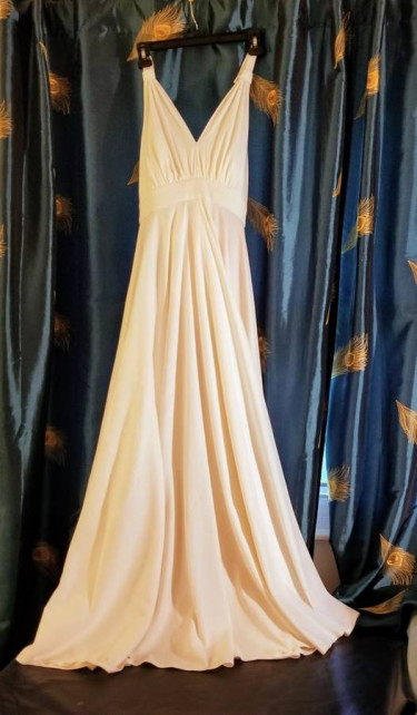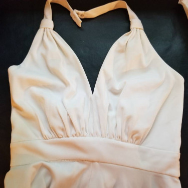 Beautiful, full skirt, long, white, halter dress - Size 8 zipper in back, snap, hook and eye fasteners on top section, Empire waistline, Measures 43-1/2" from top of zipper to floor. Only worn once. Porch pick up or meet you locally only. Cash only, please.