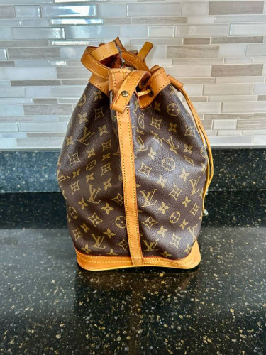 Louis Vuitton Bucket Shoulder Bag, LV Monogram, Brass Hardware, Single Adjustable Shoulder Strap, Leather Trim Embellishment, Drawstring Closure at Top