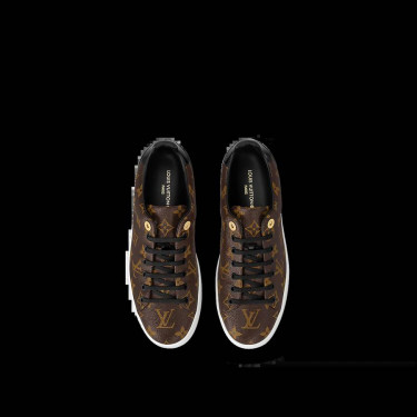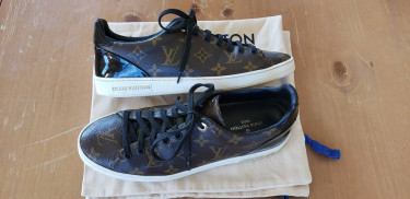 Louis Vuitton Authentic Front Row Sneakers. Reinterpreting the classic tennis shoe, this stylish sneaker in Louis Vuitton's iconic patent Monogram canvas has a clean-cut design complemented by black patent leather trim and subtle gold metal details. Patent Monogram canvasLouis Vuitton insert in the outs...