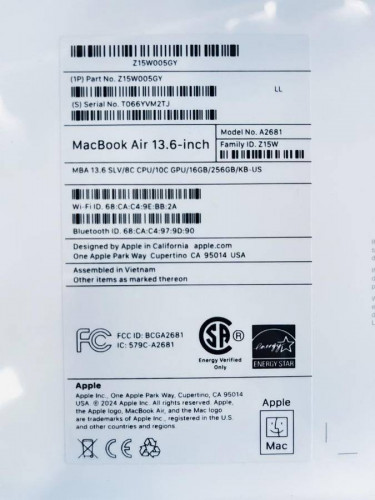MacBook Air (M2, 2022) “H91222” • Model: A2681 • Processor: Apple M2 • CPU: 8 Core • Storage: 256GB SSD • RAM: 16GB • Graphics: Apple 10 Core • Screen Size: 13.6" • Power Adapter: Yes • Cosmetic Condition: New • Color: Silver • www.hammicomputer.com • Finance Available