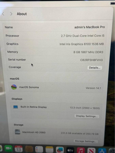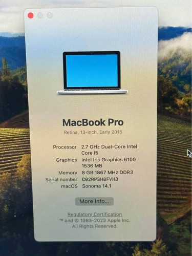 Fully restored with custom installation of OS Sonoma via Open Core! i5/8GB/256GB configuration ONLY 140 CHARGES ON BATTERY!!! Includes apple charger Cosmetic Condition A+