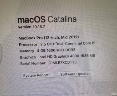 MacBook Pro 13 inch 2012 Memory 4GB 1600 MHz DdR3 2.5 GHz Dual- Core Intel Core i5 processor Intel HD graphics 4000 1536 MB graphics card Kept in hard shell case entire time. Never dropped-ever! Runs on macOS Catalina