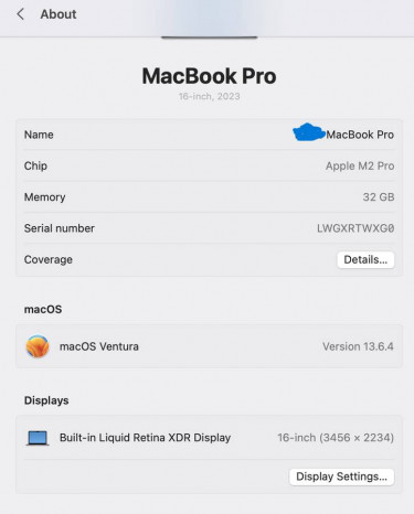 It's still under warranty until August MacBook Pro (16 inch, 2023) M2 Pro 12 cores 32GB memory 500GB storage Purchased August 2023 Warranty expires August 28, 2024 Chip: Apple M2 Pro