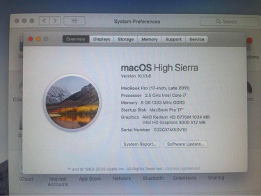 2011 MacBook Pro 17” with 24” Apple Cinema Display, new screen in 2019, new battery about the same time. i7 2.5 GHz processor, 8 gig RAM. Adapters, cords, usb ports galore, CD, matte "no-glare" screen on both the laptop and monitor. All the Apple options! Dual boot - Apple OS-X 10.13 and Windows 10 Pro...