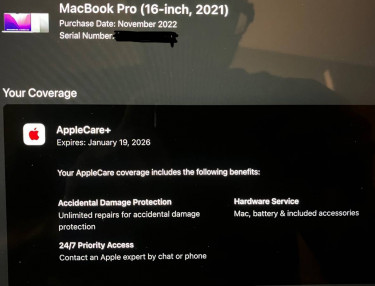 Very lightly used MacBook Pro with M1 Pro processor. 16gb memory and 1tb storage. Purchased this laptop and it’s mostly been inside my backpack. Battery is still 100 percent capacity. I also purchased the accidental damage protection which also includes a battery replacement warranty that i will try to get ap...