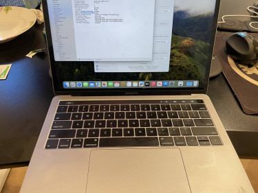 Personal Macbook pro mid 2018 version being taken care well i7 2.7 GHz CPU. No scratch, but a little bit of street fighter decal residue No haptics feedback, but no impact to the usage. Everything else works perfectly. Come with 61w adapter with an extension core 135 battery cycle count! Cash ...