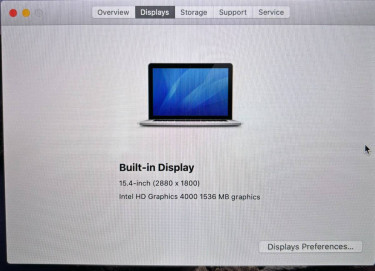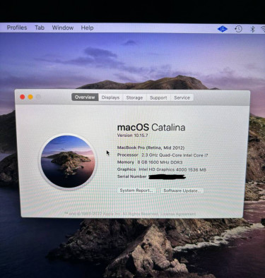 - Apple Macbook Pro Retina 15.4 Inch, Mid-2012 - 2.3GHz Intel Core i7 - 8GB RAM - 250GB SSD (Samsung SATA - added aftermarket) - Catalina OSX (10.15.7) - Graphics: Intel (HD Graphics 4000 15.36 MB) - Battery and charging block replaced recently!