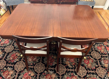 Mahagony dining room table+ 4 chairs. Includes: 3 extension leaves, table pads. Good condition. Dimensions: 61” L, 98” with leaves, 42” width, 30” H. 42 width 98 with leaves 30 height Each leaf is 12” and includes three leaves Also included are table pads for all lengths of the table Note: as...
