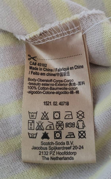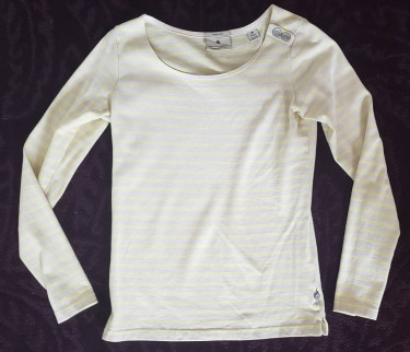 This MAISON SCOTCH “Miami Deco” striped light yellow & cream top has long sleeves, round neck, two Maison Scotch buttons on one shoulder, a small Maison Scotch tag charm on bottom, and a small slit on each side (bottom) - so chic and comfortable! There is a cute saying behind the tag – see close-up photo....