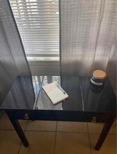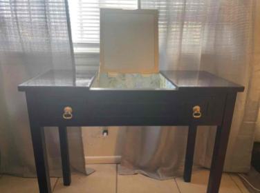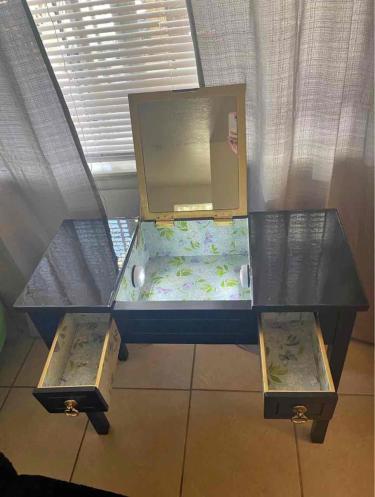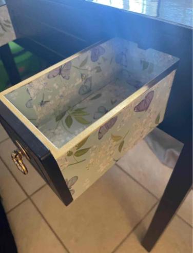 Makeup vanity with cute wallpapered inside. When not being used for that it can also be use as a work place. With neutral colored outside to go in any space. Also added new epoxy resin top coat for durability.