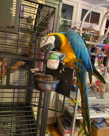 Blue and Gold Macaw, love to be out of their cage playing with their toys and love people. They talk but tomuch itemise. Some of the thing they say are tickle tickle, hello, hello Rio, kiss hello trouble woof woof, quack quck, get out, shutup. They are feeding on a mix of soak and seed for their tea. they hav...