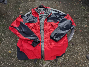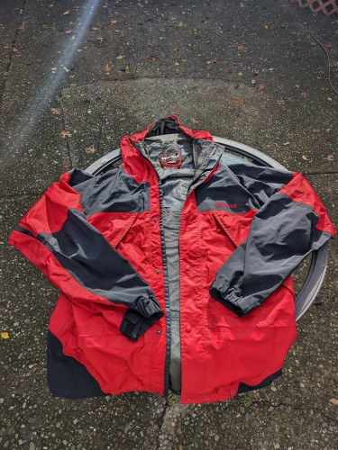 Excellent condition, men's Marmot jacket. Just don't need it right now. Lots of zippered pockets, everything works perfect. This jacket is rain proof and wind proof... it is made of gortex. It is a lightweight shell. Has a zipper in each armpit to dump heat. Also has an attached stuffsack for storage. Measure...