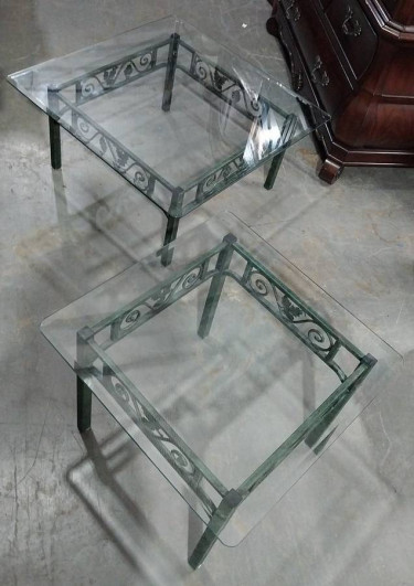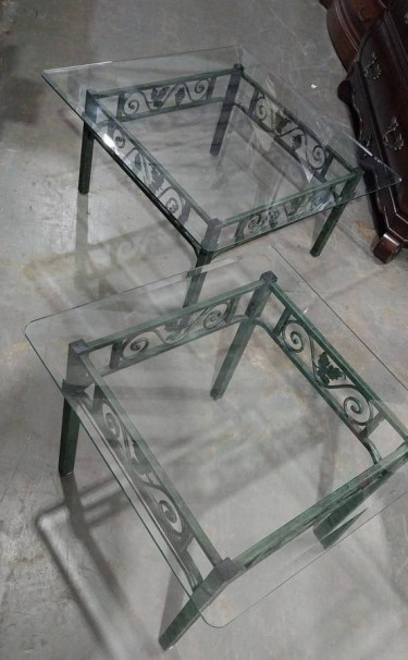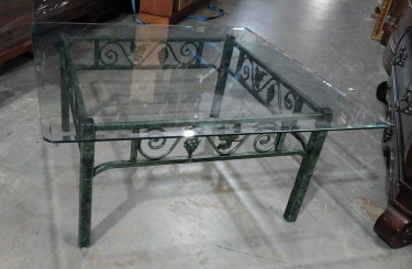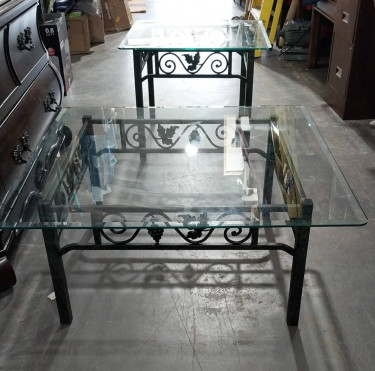 I am pleased to offer this Matching Glass Top Coffee & Side Table with Green Metal Bases with Leaf Design. The glass tops are detachable on both and are made from tempered glass. The glass pieces are heavy. The metal green bases with the leaf designs are very lite weight. They are pre-owned but in excell...