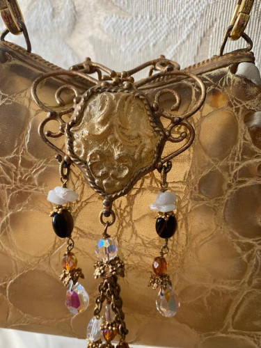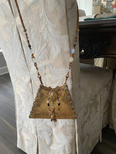 Exquisite limited edition in perfect condition bc it was maybe worn twice. It is more of a work of art. It is a gold- like neutral color. It can be a crossbody, shoulder bag or clutch. I was told they beaded and gemstone strap can be removed to wear, although I never did and not sure how. There is a decora...