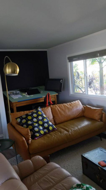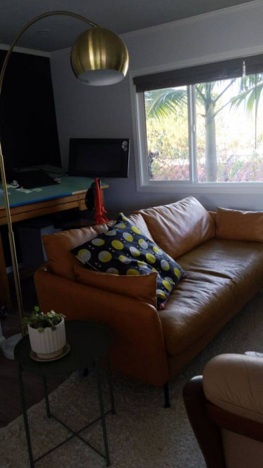 Faux leather Albany Park "Park" sofa. Great condition. Midcentury modern style with black legs. In great shape! Just no longer a good fit for my space after moving. Has been regularly cleaned and in a home with no pets, no smoke. Couch has no stains and no scratches. Link to original sofa: https://www.alb...