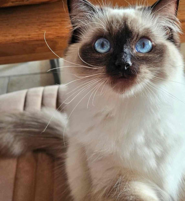 Meet your charming 13-week-old Ragdoll kitten! This little ball of fluff is already showing off her breed's signature affectionate nature. With her striking blue eyes and dark points on her ears, nose, paws, and tail, she's sure to capture hearts. Her soft, white coat is perfectly complemented by the darker f...