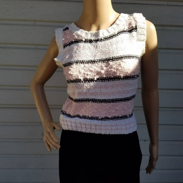 Excellent Condition - Pre-loved REDUCED from $30 to $15!!! Size: XS Shoulder to Shoulder: 14" Armpit to Armpit 15.5" Sweater Vest Length: 17" Model: 5'8", 30-24-32 - Ideal gift for your loved ones and yourself - Lush Glossy Black, White with Pink Thread and Pink Balls interweaved throughout ...