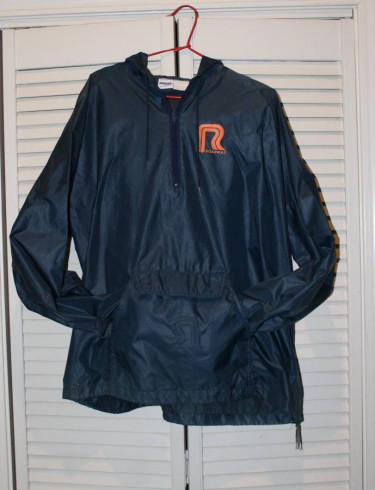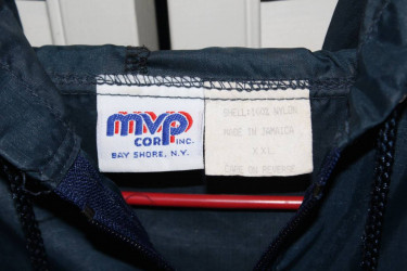 Men's navy unlined hooded wind breaker. MVP 100% Nylon waterproof shell which makes it washable. Adjustable draw string bottom to keep out the cold. Large open pocket as well as secure velcro top pocket. Size XXL. In excellent like new condition as my husband prefers a button down front. $8 Click...