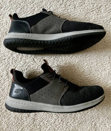 Gently used, men's Skecher's Air Cooled Memory Foam Shoes - SIZE 12 Gray and black with brown Skecher's tab DESCRIPTION FROM THE SKECHERS WEBSITE... SHOE FEATURES Stretch laced front panel for easy slip on comfort Side overlay panels with perforation accents for cooling effect High apex front inst...