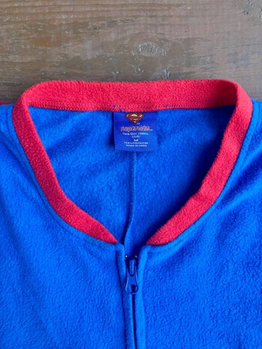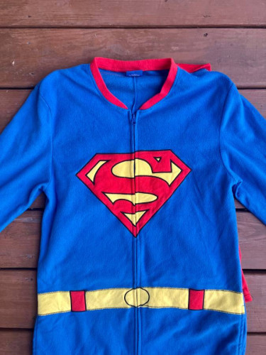 Men’s Superman Costume With Velcro Cape Size M - Like New Zippered costume is perfect for Halloween but also functions as pajamas. Durable 100% polyester construction. Dual sided cape detaches easily with two Velcro strips. Costume runs on the larger side. Torso measures 23” from top of neck to...
