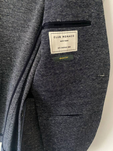 Like new, extremely comfortable, single-breasted, knit blazer from Club Monaco in Boston. The knit texture is super soft, and great for cooler months. The blazer is a size 40 but runs small. I’m 6’2” and 150 lbs and it fits perfectly. The tag says 39% polyester 37% linen 20% cotton 4% nylon. I couldn’t fin...