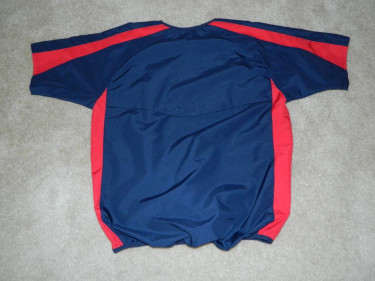 Authentic Cooperstown Dreams Park pull over short sleeve jacket/windbreaker, size small Blue with red striped accents along tops both sleeves and along both sides Official Cooperstown Dreams Park logo applique sewn on upper Elastic hem Lower left side zipper Front kangaroo style pocket Vented interna...