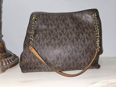 Michael Kors Brown Signature Coated Canvas Tote Bag W/Dust Bag The bag features dual top handles, an MK charm, and a signature coated canvas exterior. It has a spacious fabric-lined interior that has two open compartments divided by a zipped compartment. CASH/PICK-UP