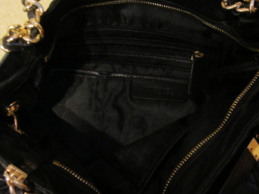 Michael Kors Susannah Medium Shoulder Tote in Black Quilted Leather. Gold-tone hardware. Chain link and leather top handles. MK circle logo charm. Top zip closure with logo jacquard lining. Interior: 4 open pockets with 1 zipper pocket inside and a key or coin purse clip. Dimensions: 12"H x 14"...