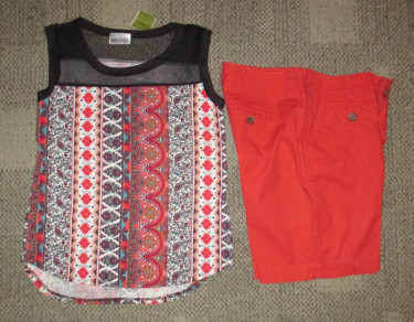 NY & Co. Chino stretch khaki shorts sz 6 Tri color knit top M New cuffed linen look tan shorts sz 6 Red orange tank L & over blouse S Cabi rose color shorts sz 6 New black neck w/floral design top M All like new- changed sizes or new.
