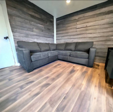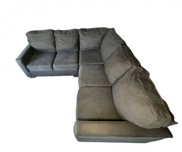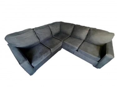 Beautiful black modern corner 2pc. sectional sofa couch in excellent condition! One previous owner had it in clean, non-smoking home. * Professionally deep cleaned and sanitized. No rips, tears, odors or stains. Cushions are nice and plush and in good form - very comfortable to lounge on! Seat cushi...