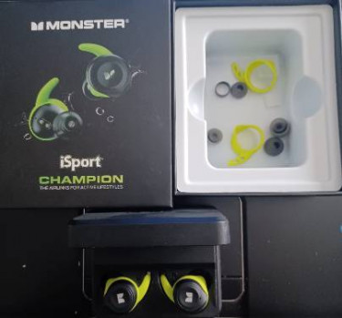 This is a pair of Monster iSport earbuds with charging case. These are basically the same thing as Airpods but are geared for people who are sports active as they don't fall out of your head running, on the court or at the bike park in Killington. I bought these for my tech support job doing phone support and...