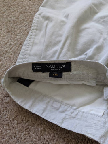 Nautica shorts retail from $30-$50. Get some nice shorts for your next boating excursion for less! Shorts fall above the knees. Not made in China! Style: Rigger Fit: Classic Size: 34W Length (top of shorts to bottom cuffs): 18 inches Width: 17 inches Leg cuff: 11 inches Inseam: 7 inches Front ...