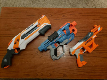 Nerf blasters with a few ammo for each blaster. Nerf NStrike Elite Roughcut 2x4 Nerf Elite 2.0 Commander Nerf Accustrike Falconfire Asking $5 for each blaster. Cash only.