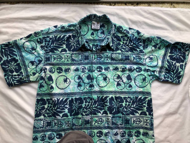This is a New WET DOG "EARTH" Hawaiian shirt in men's size small. It is 100% cotton and is in shades of aqua blue, navy blue, and white. The word "EARTH" is spelled out around the shirt (see photos - right below the sea turtles, flower, and fish.) This is a beautiful and colorful shirt. It is 22 1/2" armp...